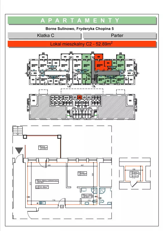 Apartament przy ul. F. Chopina 5c/2 położony na parterze, przy ul. Chopina o pow. 52,89 m2, z balkonem o pow. 14,45 m2, do lokalu przynależy komórka lokatorska o pow. 4,86 m2.