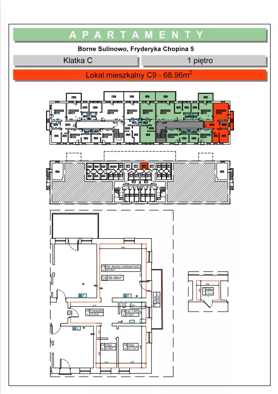 Apartament przy ul. F. Chopina 5c/9 położony na I piętrze, przy ul. Chopina o pow. 68,96 m2, mieszkanie posiada taras o pow. 6,63 m2, komórkę lokatorską o pow. 4,94 m2 oraz miejsce postojowe na parkingu.