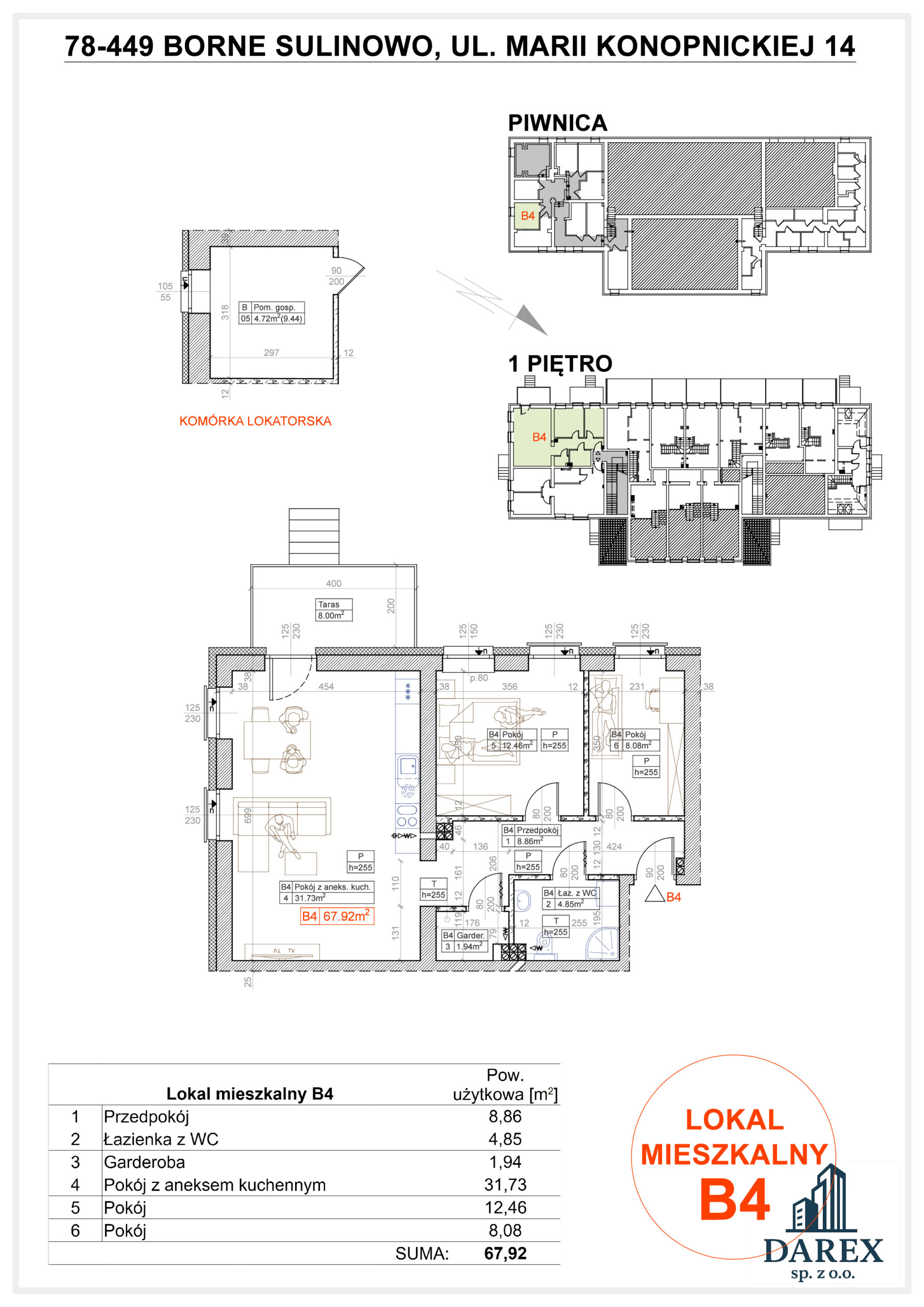 APARTAMENT 14/B4 pow. 67,92 m2 ( piwnica 4,72 m2 ) składający się z salonu z aneksem kuchennym, 2 sypialni, łazienki z wc. garderoby i przedpokoju. Zlokalizowany na pierwszym piętrze z balkonem o pow. 8 m2.