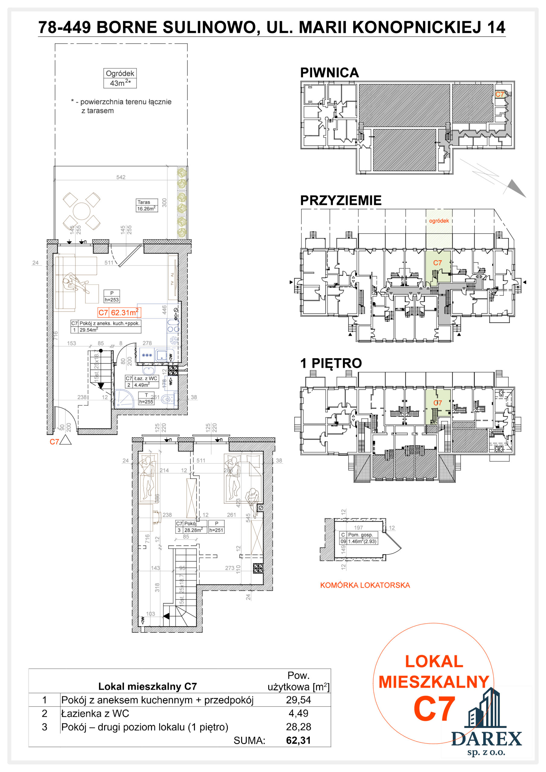 • APARTAMENT 14/C7 pow. użytkowa 62,31 ( piwnica 1,46 m2 ) dwupoziomowy położony na parterze składający się z salonu z aneksem kuchennym i łazienki z wc oraz pokoju na drugim poziomie o pow. 28,28 m2 z możliwością podziału na 2 osobne pokoje. Apartament posiada taras o pow. 16,28 m2 oraz ogród 43 m2.